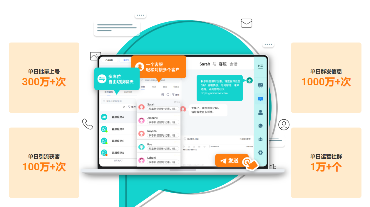 所有账号消息同步到单一工作台,支持批量操作(群发、自动回复、标签管理)。