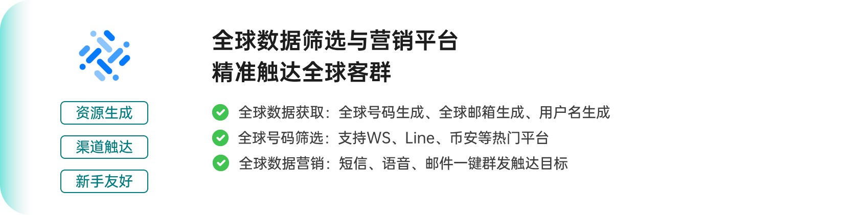 - 数据生成:自动生成全球号段、手机号、邮箱,快速覆盖新市场;