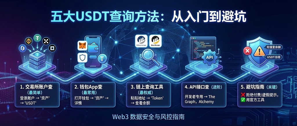 5种USDT查询方法(007TG、 钱包App、交易所、链上工具、API、避坑)。